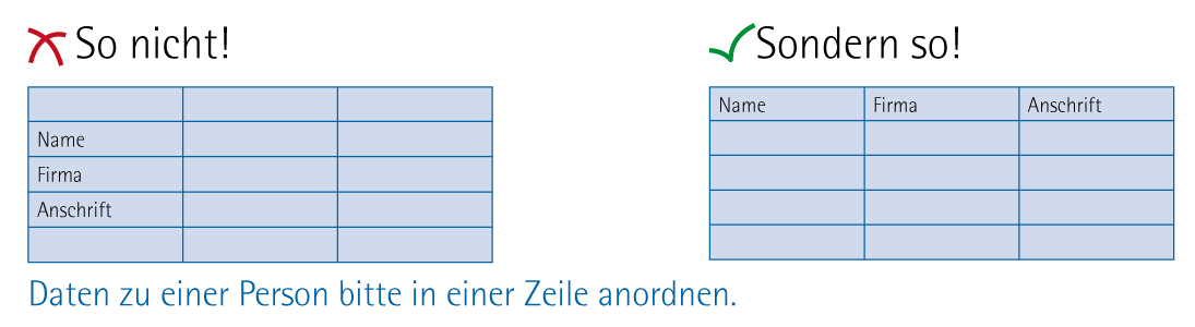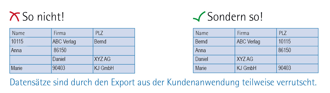 Übermitteln Sie uns so viele Informationen wie nötig, aber so wenige wie möglich. Denn jede überflüssige Spalte birgt die Gefahr von Fehlern und Verwechslungen. Daher sollten Sie vor der Übermittlung Ihrer Tabelle alle nicht benötigten Daten entfernen. Bitte achten Sie außerdem darauf, dass Ihre Spaltenbezeichnungen eindeutig und logisch sind. Schauen Sie sich Ihre Dateien nach dem Export aus Ihrer Datenbankanwendung noch einmal genau an und überprüfen Sie, ob keine Spalten verrutscht sind oder vertauscht wurden wie in der unten stehenden Abbildung zu sehen ist